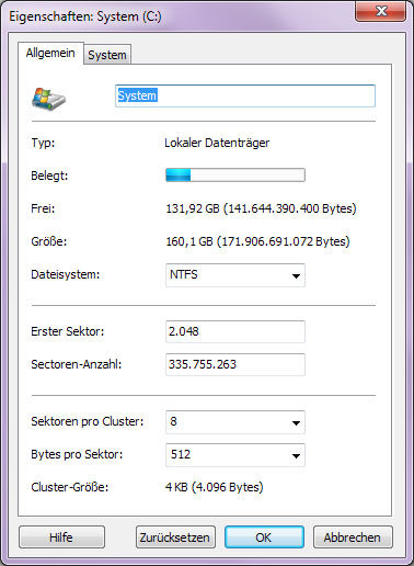 Um die Eigenschaften des Betriebssystems zu erkunden, öffnen Sie die Eigenschaften einer beliebigen Platte und gehen Sie auf den Reiter „System“.